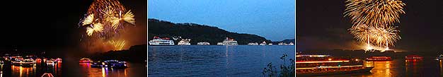 Eventschiffe mit DJ-Musik und Feuerwerk auf dem Rhein